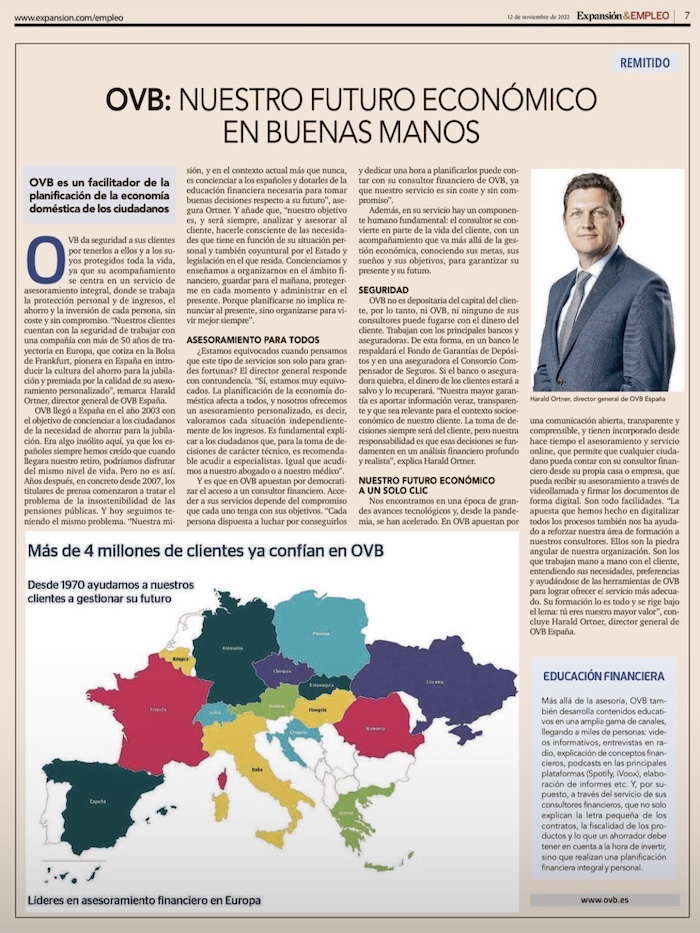 En OVB llevamos más de 50 años dando servicio a nuestros clientes para mejorar su capacidad financiera y cuidar de su futuro. A punto de cumplir los 20 años operando en España, el diario Expansión recoge una entrevista a nuestro director general en España, Harald Ortner, donde recoge la esencia de lo que OVB ofrece a sus clientes.